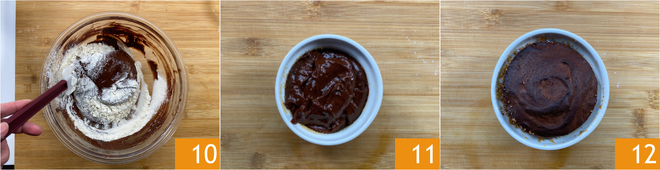 Rühren Sie weiter mit dem Spatel 10 oder dem Schneebesen, bis Sie eine glatte Masse erhalten. Fetten Sie 6 Förmchen mit Butter ein und bestreuen Sie sie mit Rohrzucker, jede mit einem Fassungsvermögen von 140 g. Backen Sie bei 180° in der Heißluftfritteuse für 8-9 Minuten. Sobald sie aus dem Ofen sind 12, die Schokoladenküchlein auf Teller stürzen und mit Puderzucker bestreuen.
