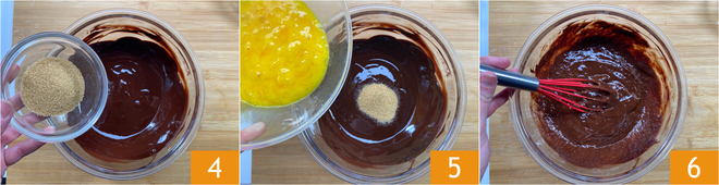 Fügen Sie den Zucker 4, die verquirlten Eier 5 hinzu und rühren Sie mit dem Schneebesen 6.