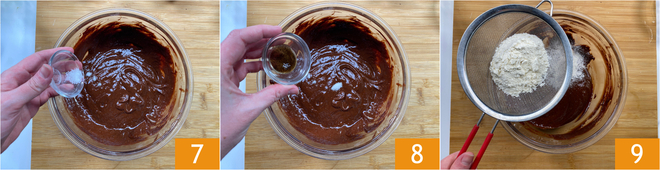 Fügen Sie auch das Salz 7 und den Vanilleextrakt 8 hinzu. Sieben Sie das Mehl in die Schüssel 9.