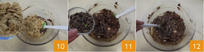 und fügen Sie sie der Butter-Schokoladen-Mischung hinzu 10; rühren Sie mit einem Spatel um und fügen Sie dann auch die ganzen Pistazien hinzu 11 und vermengen Sie alles weiter mit einem Spatel 12.