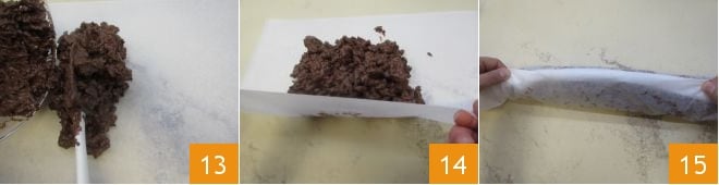 Geben Sie die Mischung in die Mitte eines Blattes Backpapier 13, um Ihre Schokoladensalami ohne Eier zu formen: Heben Sie die Ränder des Papiers an 14, bringen Sie sie zusammen und rollen Sie sie dann zu sich selbst hin auf 15, bis Sie die Salami verschließen.