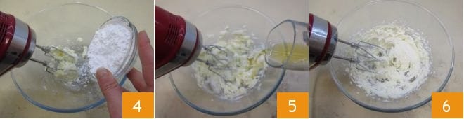 In der Zwischenzeit schlagen Sie in einer Schüssel mit einem elektrischen Mixer die weiche Butter zusammen mit dem Puderzucker 4. Sobald Sie eine cremige Mischung erhalten haben, gießen Sie bei weiterem Schlagen den Grand Marnier in einem dünnen Strahl dazu 5, bis Sie eine cremige Masse erhalten 6.