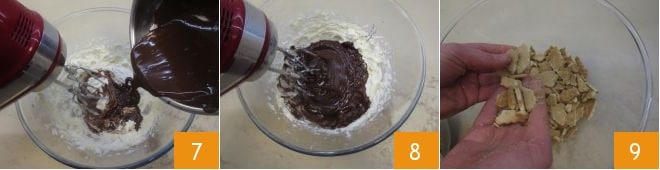 Geben Sie auch die inzwischen abgekühlte Schokolade hinzu 7 und schlagen Sie weiter 8, bis Sie einen homogenen Teig erhalten. Nun brechen Sie die Kekse grob mit den Händen 9