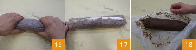 Drücken Sie vorsichtig von innen nach außen, um die klassische „Salami“-Form zu geben 16. Verschließen Sie sie wie ein Bonbon, indem Sie die Enden versiegeln 17 und lassen Sie sie mindestens 2 Stunden im Kühlschrank fest werden. Dann packen Sie Ihre Schokoladensalami ohne Eier aus 18