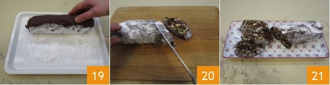 und rollen Sie sie in Puderzucker auf einem Tablett 19. Dann schneiden Sie sie in Scheiben 20 und servieren Sie Ihre Schokoladensalami ohne Eier 21!