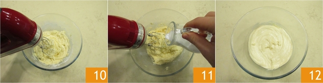 Fügen Sie auch die Prise Salz hinzu und schlagen Sie erneut, um die trockenen Zutaten einzuarbeiten 10. Sie werden bemerken, dass der Teig fester wird, also verdünnen Sie ihn mit der bei Zimmertemperatur in einem dünnen Strahl hinzugefügten Milch 11. Nun wird die Mischung weich und kompakt sein 12.