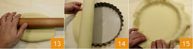 Nach der erforderlichen Zeit nehmen Sie den Mürbeteigballen und rollen ihn auf einer leicht bemehlten Arbeitsfläche zu einer Scheibe von 4 mm Dicke aus 13. Rollen Sie die Mürbeteigscheibe um das Nudelholz und legen Sie sie vorsichtig auf eine vorher eingefettete 25 cm große Form 14 (wenn der Teig zum Bröckeln neigt, können Sie den Ballen zwischen zwei Bögen Backpapier legen und mit dem Nudelholz ausrollen). Drücken Sie den Boden und die Ränder leicht mit den Fingern an 15,