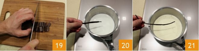 In der Zwischenzeit bereiten Sie den Schokoladenflan vor: Hacken Sie die dunkle Schokolade 19 und setzen Sie einen Topf mit Milch und Sahne auf den Herd. Schneiden Sie eine Vanilleschote der Länge nach auf und entnehmen Sie die Samen, indem Sie sie mit einem kleinen Messer auskratzen; fügen Sie die Samen und die ganze Schote zur Milch-Sahne-Mischung hinzu 20. In einer separaten kleinen Schüssel schlagen Sie die Eier mit dem Zucker. Nehmen Sie die Schote mit einer Küchenzange heraus 21, dann