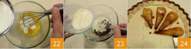 gießen Sie die heiße Milch-Sahne-Mischung auf die Eier-Zucker-Mischung und rühren Sie, um alle Zutaten gut zu vermischen 22. Gießen Sie die Mischung auf die gehackte Schokolade und mischen Sie mit den Schneebesen 23: Falls sich Bläschen bilden, können Sie sie mit einem Teelöffel entfernen. An dieser Stelle können Sie die karamellisierten Birnen in Strahlenform auf dem Mürbeteigboden anordnen, wobei die gewölbte Seite nach außen und die dünnere Seite zur Mitte zeigt 24.