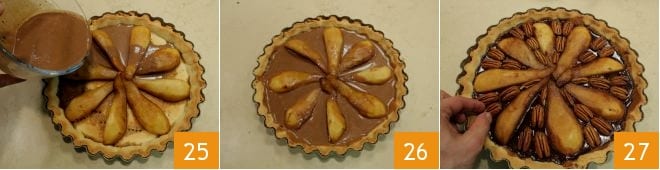 Gießen Sie das restliche Karamell darauf, dann fügen Sie den Flan hinzu 25 und verteilen ihn gleichmäßig über die gesamte Tarte 26. Backen Sie sie im vorgeheizten statischen Ofen bei 150°C etwa 40 Minuten (oder bei 130°C 30 Minuten im Umluftofen): 5 Minuten vor dem Ende verteilen Sie die Pekannüsse mit der glatten Seite nach unten auf dem dunklen Schokoladenflan 27 und beenden das Backen. Sobald sie fertig ist, nehmen Sie die Tarte aus dem Ofen und lassen Sie sie vollständig abkühlen; schließlich können Sie Ihre Schokoladentarte mit Birnen und Pekannüssen servieren und genießen.