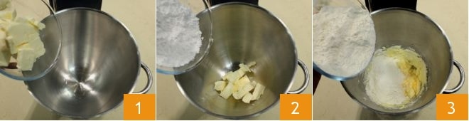 das gesiebte Mandelmehl 4 und die Prise Salz 5. Fahren Sie mit dem Flachrührer fort, dann übertragen Sie den Teig auf eine Arbeitsfläche und bearbeiten Sie ihn schnell, gerade so lange, bis er kompakt ist 6.