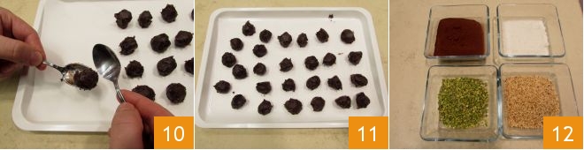 Beginnen Sie dann, Ihre Trüffel zu formen: Nehmen Sie kleine Portionen der Schokoladenmischung (ca. 12-15 g) und formen Sie mit Hilfe von 2 Löffeln (oder mit den Händen, die Sie vorher anfeuchten sollten) kleine Kugeln 10. Während Sie sie formen, legen Sie die Trüffel auf ein mit Backpapier ausgelegtes Tablett, das Sie für mindestens 30 Minuten in den Kühlschrank stellen 11. Mit unseren Mengen sollten Sie 40 Trüffel erhalten. Nach der erforderlichen Zeit geben Sie die gehackten Haselnüsse und Pistazien, die geraspelte Kokosnuss und das Kakaopulver in 4 kleine Schüsseln, um die Überzüge zu machen 12.