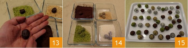 Rollen Sie jeden Trüffel in der Schüssel mit dem Überzug 13, sodass dieser gleichmäßig haftet 14. Schließlich servieren Sie die Schokoladentrüffel in kleinen silbernen Papierförmchen 15, begleitet von einem guten Kaffee oder heißem Tee.