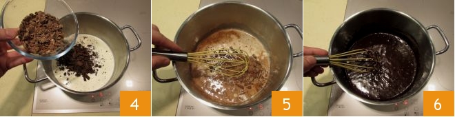 Fügen Sie nun die zuvor gehackte Milchschokolade hinzu 4. Rühren Sie mit einem Schneebesen 5 und lassen Sie alles vollständig schmelzen. Rühren Sie weiter, bis Sie eine cremige und klumpenfreie Mischung erhalten 6.