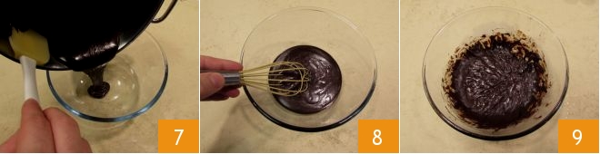 Übertragen Sie die vorbereitete Ganache in eine Schüssel 7 und lassen Sie sie abkühlen; wenn die Mischung kalt, aber noch nicht vollständig fest ist, rühren Sie energisch mit einem Schneebesen 8, um eine hellere und leichtere Mischung zu erhalten: Die Ganache sollte nicht zu fest werden, sonst wird es schwierig, sie zu verarbeiten 9.