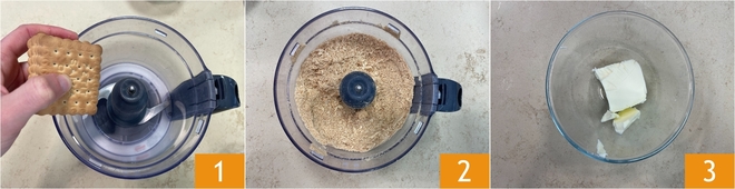 Um die Schokoladenzapfen zuzubereiten, beginnen Sie damit, die Butterkekse in einem Mixer 1 zu einer feinen und gleichmäßigen Pulver zu mahlen 2, dann geben Sie sie in eine große Schüssel. Gießen Sie die Butter in eine andere Schüssel 3 und schmelzen Sie sie in der Mikrowelle.
