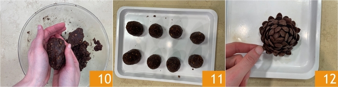 Formen Sie nun die Zapfen, indem Sie den Teig zu kleinen Pyramiden modellieren 10; mit diesen Mengen erhalten Sie 8 Stück. Legen Sie sie nach und nach auf ein Tablett 11 oder einen Teller. Jetzt können Sie zum unterhaltsamsten Teil übergehen: die Zapfen mit Schokoladen-Cerealien dekorieren. Platzieren Sie die Cerealien einzeln, beginnend an der Spitze und weiter zur Basis hin, um konzentrische Kreise zu bilden, die die charakteristische „Zapfenform“ ergeben 12.