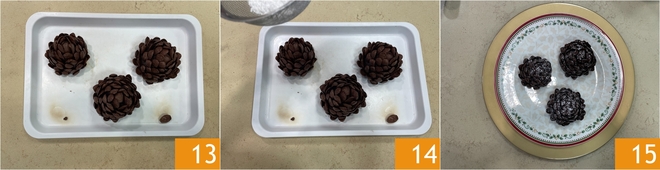 Wenn alle Zapfen fertig sind 13, stellen Sie sie in den Kühlschrank und lassen Sie sie mindestens eine halbe Stunde fest werden. Dekorieren Sie die Schokoladenzapfen mit Puderzucker 14 und servieren Sie sie 15!