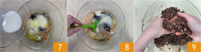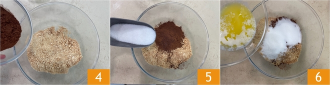 Inzwischen fügen Sie zu den Keksen in der Schüssel den ungesüßten Kakao 4 und den Zucker 5 hinzu, dann gießen Sie die leicht abgekühlte geschmolzene Butter 6 dazu.