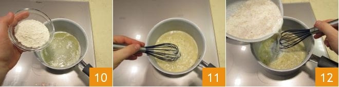 und wenn sie geschmolzen ist, geben Sie das Mehl hinzu 10 und rühren Sie mit einem Schneebesen, kochen Sie es für ein paar Minuten, so erhalten Sie die Verdickungsgrundlage namens Roux 11. Verdünnen Sie es mit der heißen Milch, während Sie rühren 12