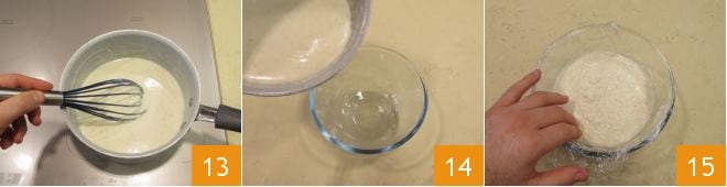 und setzen Sie das Kochen fort, indem Sie ständig mit dem Schneebesen arbeiten, bis die Sauce kocht 13. Übertragen Sie alles in eine Schüssel 14, bedecken Sie es mit Frischhaltefolie, sodass sie die Oberfläche berührt, und lassen Sie es bei Raumtemperatur abkühlen 15.