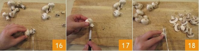 Machen Sie mit der Füllung weiter: Beginnen Sie mit der Reinigung der Champignon-Pilze. Zuerst entfernen Sie den Stiel 16, dann kratzen Sie mit einem Pinsel den gesamten Schmutz ab 17 und schneiden Sie sie schließlich in dünne Scheiben 18. Denken Sie daran, dass es ratsam ist, Pilze nicht zu waschen, um zu verhindern, dass sie zu viel Wasser aufnehmen und so an Geschmack und Konsistenz verlieren. Nur wenn sie besonders schmutzig sind, können Sie sie kurz unter fließendem Wasser abspülen oder mit einem feuchten Tuch reinigen.