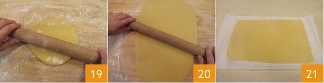 Nehmen Sie den Teig zurück und rollen Sie ihn mit einem Nudelholz auf einer leicht bemehlten Arbeitsfläche aus 19, Sie sollten ein Rechteck von 50x30 cm mit einer Dicke von etwa 1-2 mm erhalten 20, gegebenenfalls können Sie die Ränder mit einem Messer glätten. Übertragen Sie den Teig auf ein Backpapier 21;