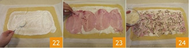 Verteilen Sie dann 2-3 großzügige Löffel Béchamelsauce gleichmäßig auf der gesamten Oberfläche und lassen Sie ein paar Zentimeter an den Rändern frei 22. Dann beginnen Sie mit der Füllung, indem Sie die Schinkenscheiben 23, die Pilze darauflegen und mit geriebenem Parmesankäse (etwas davon beiseite lassen) sowie einer Prise Salz bestreuen 24.