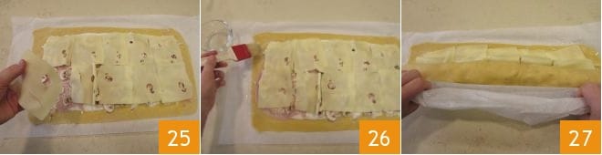 Zum Schluss legen Sie die Emmentalerscheiben darauf 25. Befeuchten Sie die Ränder mit sehr wenig Wasser, damit sie klebrig werden 26 und rollen Sie den Teig dann mit Hilfe des Backpapiers 27.