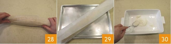 Wickeln Sie die Rolle in das Papier 28 und legen Sie sie auf ein Tablett, das Sie für etwa 20 Minuten in den Gefrierschrank stellen 29. Dieser Schritt ist wichtig, um die Form beim Schneiden perfekt zu halten. In der Zwischenzeit geben Sie ein paar weitere Löffel Béchamelsauce in eine 30x20 cm große Auflaufform und verteilen Sie sie gleichmäßig auf der gesamten Oberfläche 30.