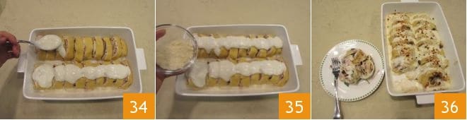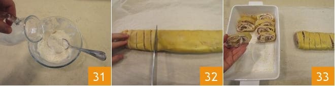 Dann verdünnen Sie die Béchamelsauce mit den restlichen 50 Gramm Milch, um sie viel weicher zu machen, und halten Sie sie bereit: Sie wird später zum Würzen benötigt 31. Nach der Festigungszeit nehmen Sie die Rolle heraus und schneiden Sie sie in 20 Spiralen von jeweils etwa zwei Zentimetern 32. Dann legen Sie diese in die Auflaufform, eine über die andere und leicht überlappend und geneigt 33.