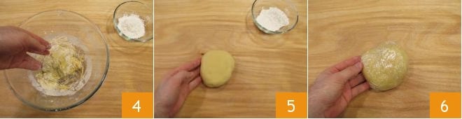 Dann machen Sie mit den Händen weiter 4, und wenn Sie einen kompakteren Teig haben, legen Sie ihn auf die Arbeitsfläche und kneten Sie weiter, bis der Teig glatt und homogen ist: Fügen Sie nach Bedarf Mehl hinzu 5. Wickeln Sie den Teigball in Frischhaltefolie und lassen Sie ihn bei Raumtemperatur etwa eine halbe Stunde ruhen 6.