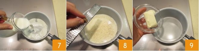 In der Zwischenzeit widmen Sie sich der Zubereitung der Béchamel. Erhitzen Sie 500 g Milch in einem kleinen Topf 7 und aromatisieren Sie sie, indem Sie etwas Muskatnuss reiben 8. In einem anderen Topf schmelzen Sie die Butter 9
