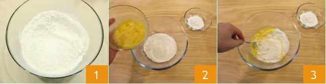 Um die Schwalbennester zuzubereiten, beginnen Sie mit der Frische Eiernudeln (Teig und Formate). Geben Sie das Mehl in eine Schüssel 1 und dann auf eine Arbeitsfläche oder Arbeitsplatte, und fügen Sie die Eier bei Raumtemperatur hinzu. Denken Sie daran, immer etwas Mehl beiseite zu halten, da die Eier möglicherweise nicht alles aufnehmen können 2. Beginnen Sie mit einer Gabel zu mischen 3.