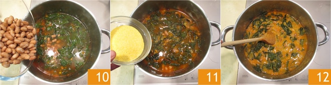 Integrieren Sie auch die abgegossenen Bohnen 10 und kochen Sie weitere 30 Minuten. Fügen Sie dann das Maismehl für Instant-Polenta hinzu und kochen Sie es, bis es aufgenommen ist 11. Sobald die Farinata eine dichte Konsistenz erreicht hat, ist sie bereit 12. Servieren Sie sie heiß mit einem Schuss rohem Öl.