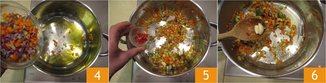 Fügen Sie das Gemüse 4, die Chilischote 5 und ein paar Salbeiblätter hinzu. Lassen Sie es anbraten und entfernen Sie dann den Knoblauch 6.