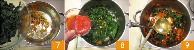Geben Sie den Kohl hinzu 7, lassen Sie ihn ein paar Minuten weich werden, dann fügen Sie das Tomatenpüree 8 und das Tomatenmark hinzu. Verdünnen Sie es mit der Brühe, bis es bedeckt ist 9. Kochen Sie es etwa 30 Minuten und würzen Sie mit Salz und Pfeffer ab.