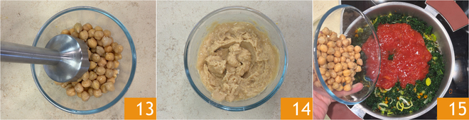 Während der Schwarzkohl kurz zusammenfällt, pürieren Sie die Hälfte der Kichererbsen mit wenig Wasser 13, um eine Creme zu erhalten 14. Fügen Sie die ganzen Kichererbsen in den Topf hinzu 15.