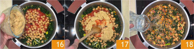 Fügen Sie auch die Kichererbsen-Creme hinzu 16 und mischen Sie gut, um alles zu verbinden 17. Decken Sie mit Gemüsebrühe ab 18 und kochen Sie bei mittlerer Hitze etwa 20 Minuten weiter.