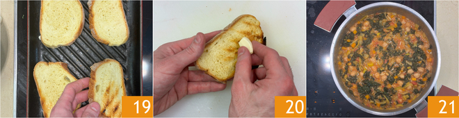 Während die Suppe kocht, rösten Sie die Brotscheiben auf einem Grill von beiden Seiten 19, dann reiben Sie sie mit einer Knoblauchzehe ein 20. Nach der Kochzeit ist die Suppe dick und gehaltvoll 21.
