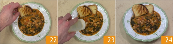 Vervollständigen Sie jeden Teller mit einer Scheibe geröstetem Brot 22, einem Schuss Öl 23 und einer Prise Pfeffer. Ihre Schwarzkohlsuppe ist bereit zum Genießen 24!