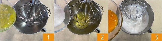 Um das Schwarzwald-Zuccotto vorzubereiten, beginnen Sie mit dem Kakaobiskuit: Schlagen Sie in einer Küchenmaschine mit Schneebesen die Eiweiße 1 mit dem Zucker 2, bis sie cremig und glänzend sind. Schlagen Sie die Eigelbe mit einer Gabel und heben Sie sie mit einem Spatel unter die Masse 3.