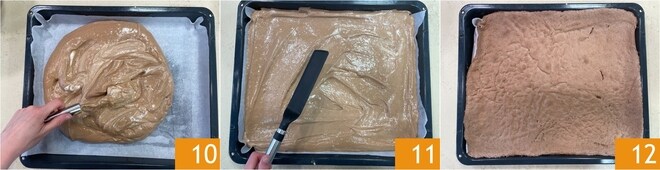 Gießen Sie den Teig in eine etwa 45x37 cm große Backform, die mit Öl eingefettet und mit Backpapier ausgelegt ist 10, glätten Sie ihn gut mit dem Spatel 11 und backen Sie ihn im vorgeheizten statischen Ofen bei 190°C für etwa 15-20 Minuten auf der mittleren Schiene. Nehmen Sie den Biskuitboden aus dem Ofen 12.