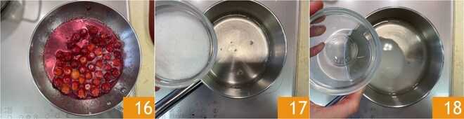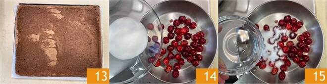 Stürzen Sie den noch warmen Kuchen sofort 13, dann bedecken Sie die gesamte Oberfläche mit Frischhaltefolie und lassen Sie ihn abkühlen. Entkernen Sie die Kirschen und kochen Sie sie in einer Pfanne mit dem Zucker 14 und dem Likör 15.