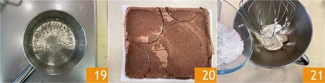 Lassen Sie sie vollständig abkühlen 16 und bereiten Sie die Tränke vor: Bringen Sie das Wasser mit dem Zucker zum Kochen 17, lassen Sie es abkühlen und fügen Sie auch den Likör hinzu 18.