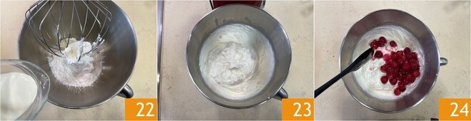 Gießen Sie die frische Sahne 22 hinein und schlagen Sie die Creme, bis sie luftig und homogen ist 23. Nehmen Sie 500 g der Masse und fügen Sie die gekochten Kirschen hinzu 24; bewahren Sie den Rest der Masse im Kühlschrank auf, der zum Dekorieren verwendet wird.