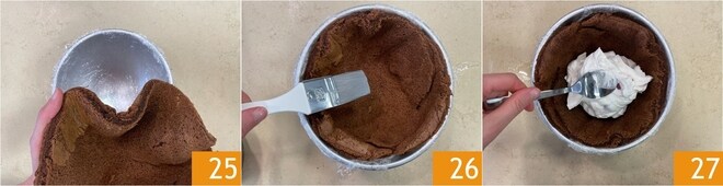Kleiden Sie eine etwa 10 cm hohe Zuccotto-Form mit einem Bodendurchmesser von etwa 20 cm mit Frischhaltefolie aus. Legen Sie den größten Biskuit-Kreis hinein 25 und befeuchten Sie ihn mit der Tränke 26. Geben Sie die Hälfte der Füllung in die Form 27.