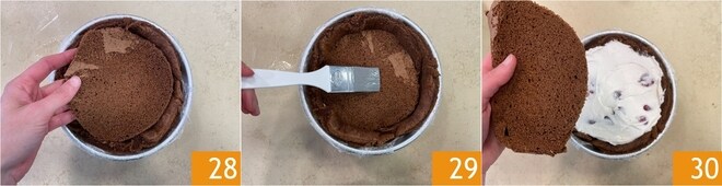 Legen Sie dann den kleinsten Biskuit-Kreis darauf 28 und befeuchten Sie ihn von beiden Seiten 29. Fügen Sie die restliche Füllung hinzu und schließen Sie mit dem aus den Stücken geschnittenen Zwischenkreis ab 30.
