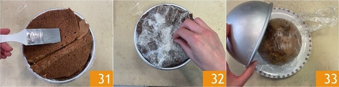Feuchten Sie leicht an und schließen Sie die Oberfläche mit Frischhaltefolie anliegend ab 32. Stellen Sie es für mindestens 3 Stunden in den Kühlschrank. Nachdem die Ruhezeit verstrichen ist, stürzen Sie das Zuccotto auf eine Servierplatte 33.