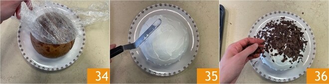 Entfernen Sie die Frischhaltefolie 34 und bedecken Sie die gesamte Oberfläche mit einer dünnen Schicht der übrigen Sahne-Mascarpone-Masse 35. Mit einem Sparschäler Schokoladenlocken herstellen und diese auf der Oberfläche des Zuccottos anbringen 36.